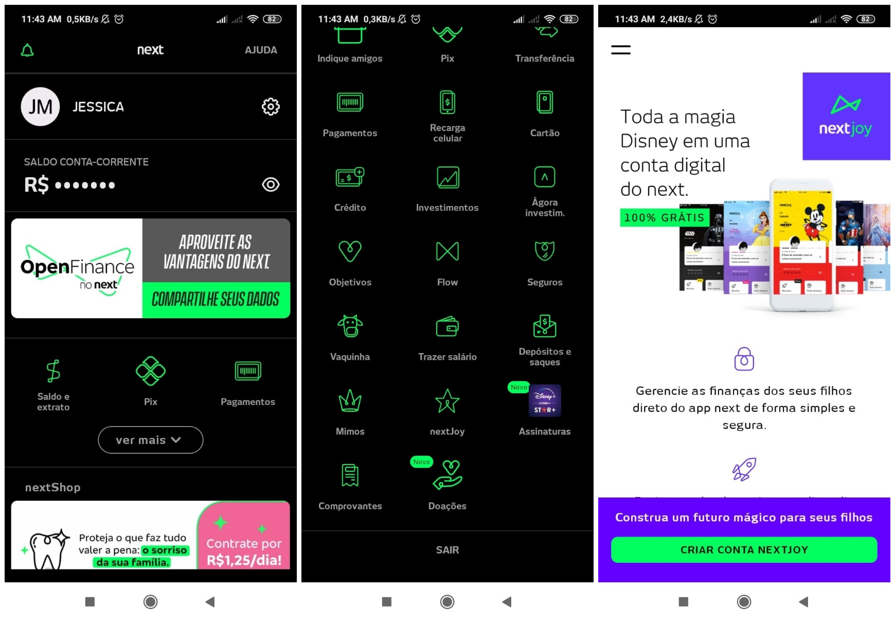 Agora, se o responsável já possui a conta Next aberta, vá até a tela principal, clique em “ver mais”, em seguida, clique em NextJoy. Depois, é só iniciar a abertura de conta para os seus filhos.