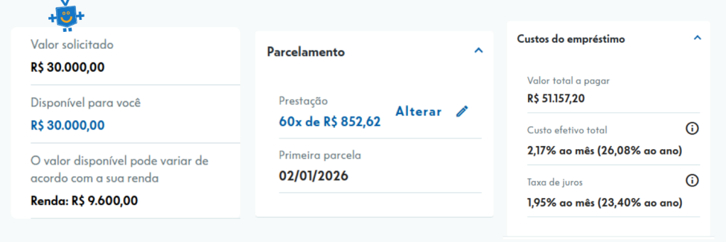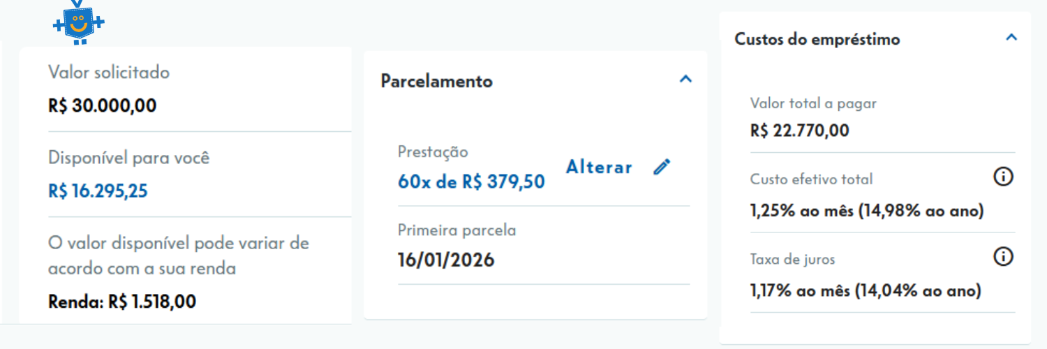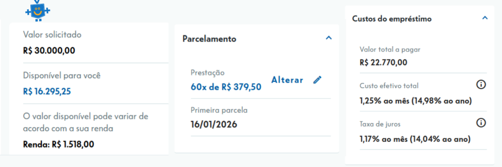 Solicitando o valor máximo, com a renda máxima (R$9.600) e o prazo máximo, os juros são de 1,95% ao mes e CET de 2,17%. Note que o máximo valor disponível é igual ao solicitado, R$30.000.