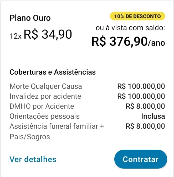 Com esse produto, você conta com a cobertura em casos de morte e invalidez permanente por acidente, despesas médicas, hospitalares e odontológicas, assistência funeral individual ou familiar, com opção para pais e sogros (dependendo do plano escolhido), além de orientações psicológicas, sociais, jurídicas e financeiras.