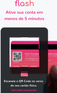 Agora, para vincular seu cartão físico, se você estiver no aplicativo, clique em “Vincular Cartão Físico” e vai abrir o leitor de QR Code do seu celular. Basta direcionar a câmera para o QR Code que fica atrás do cartão da Flash, como na foto abaixo.